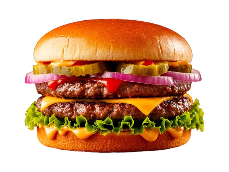 Бургер для любителей мяса с двумя сочными котлетами из говядины, нежными ломтиками сыра Чеддер, свежими овощами, придающими легкость, солеными огурчиками, двумя видами лука и заправкой из сырного соуса и кетчупа. *Внешний вид продукта может отличаться от представленного на изображении.