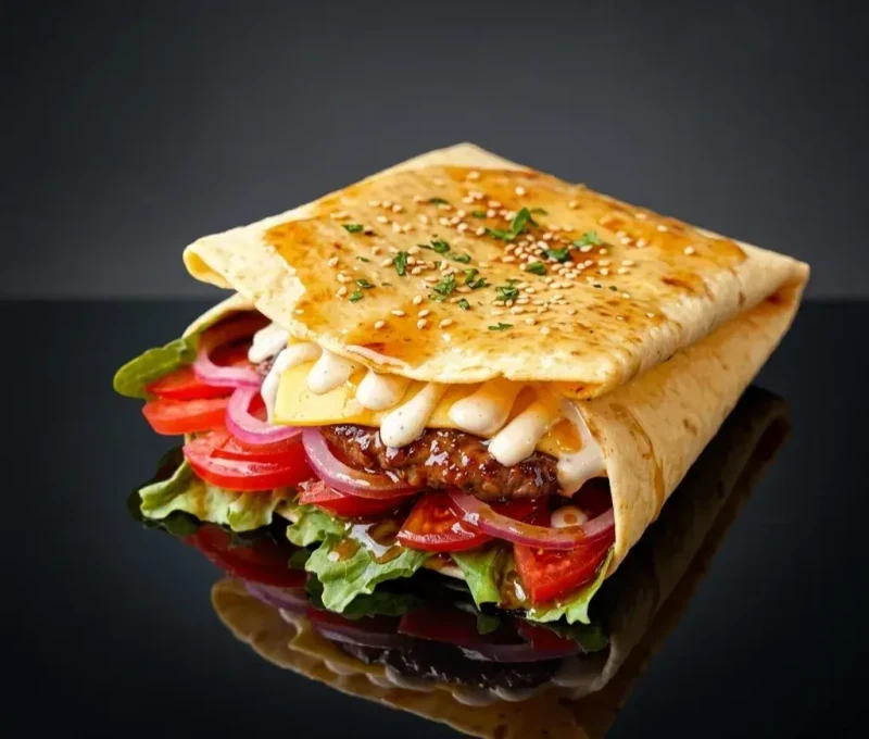 Обжаренная говяжья котлета, свежие помидоры, лук красный, салат айсберг, сыр Чеддер, честочный соус, фирменный соус, тортилья сырная. *Внешний вид продукта может отличаться от представленного на изображении.