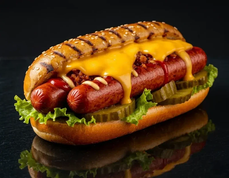 Булочка, двойная колбаска гриль, салат айсберг, маринованные огурчики, жареный лук, красный соус, сыр. *Внешний вид продукта может отличаться от представленного на изображении.