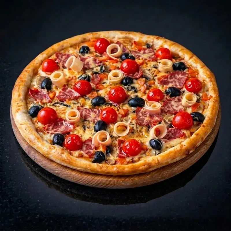 Соус красный, оливки, грибы, помидоры, жареная курица, колбаска вареная, сыр моцарелла. *Внешний вид продукта может отличаться от представленного на изображении.